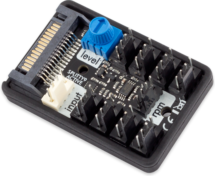 SPLITTY9 ACTIVE ist ein aktiver 9-fach Splitter für 4-pin PWM-Lüfter mit Spannungseinspeisung, Verstärkung des PWM-Signals und einstellbarer Einschaltschwelle.